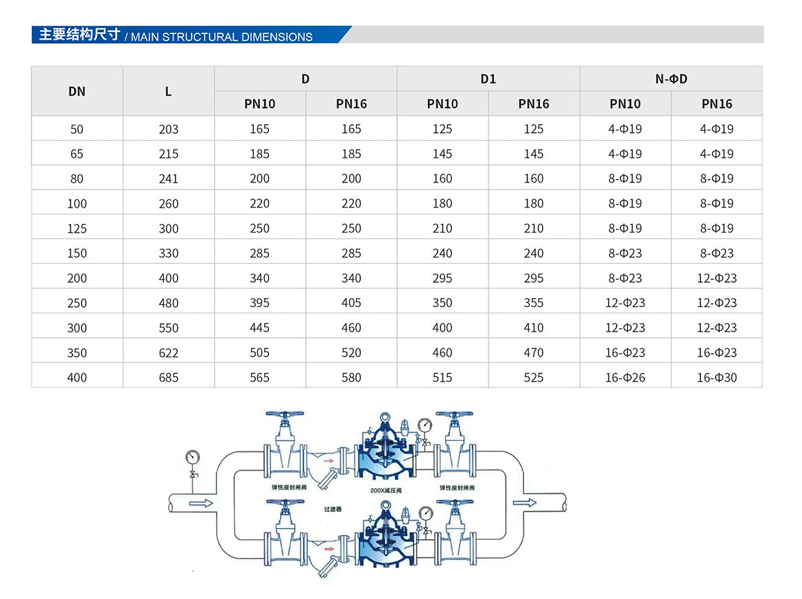 主要控制主閥的固定出口壓力,主閥出口壓力不因進(jìn)口壓力變化而改變,亦不因主閥出口流量的變化而改變其出口壓力。適用于工業(yè)給水、消防供水及生活用水管網(wǎng)系統(tǒng)。